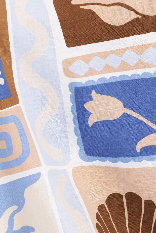 Inspired by seaside vacations, theΒ Adi Dress is made from a high quality linen cotton fabric with our exclusive Solis print. It features a deep V neckline with tie detail, curved underbust seam, boxy top overlay and a mini a-line skirt. Style your look with the tan Kia Sandals! Designed exclusively by Sabo.