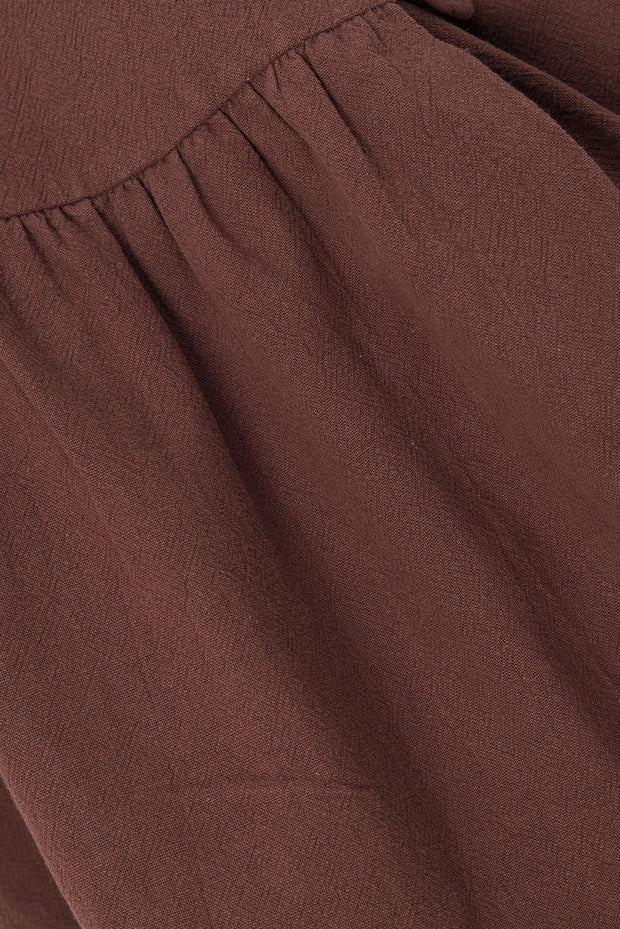 *BACK IN STOCK*Β Perfect for date night, theΒ Alfresco Dress is made from a natural cotton fabric in a chocolate brown hue. It features a wide boat neckline, wrap panel at front with covered button details, an asymmetric waist seam with a gathered mini skirt. Dress it up with the Dia Heels! Designed exclusively by Sabo.