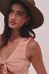 Designed to flatter, theΒ Bailee Dress is made from a natural cotton voile fabric in a salmon hue with self check throughout. It features a V neckline, tie and cutout details at bodice, pockets and a flouncy mini skirt. Dress it up with the Savannah Heels for date night! Designed exclusively by Sabo.