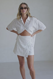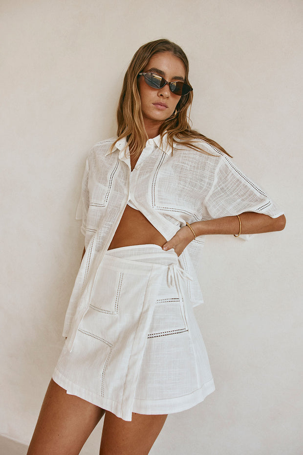Wear it as a set or use it as a styling piece, theΒ Banks Skirt is made from a natural cotton cheesecloth fabric in white. It is a high waisted style featuring a wrap panel at front with side tie closure, lace panel detailing and mini length hem. Get the set with the Banks Top. Designed exclusively by Sabo.