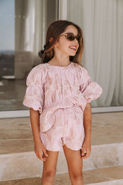Let your mini step into their next birthday party in the Bikkie Mini Shorts, made from a lightweight fabric with a bold embroidered floral print. A boxy style with elasticated waist and drawstring. Get the look with the Bikkie Mini Top. Designed exclusively by Sabo.