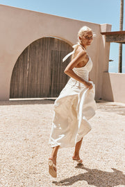 A flattering style fit for an event, theΒ Blaire Dress features a pleated bust with halter tie neck, fitted waist panel and billowing maxi skirt. Dress it up with the Bobbi Heels! Designed exclusively by Sabo.