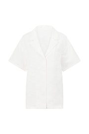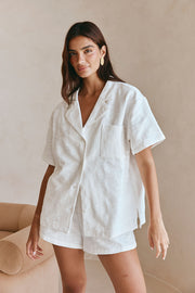 A relaxed SABO signature set, theΒ Cena Top is made from a natural cotton blend self check fabric in white. It is a boxy oversized style featuring an open label collar with button closure, single breast pocket and drop shoulders with boxy short sleeves. Get the look with the Cena Shorts or Aaliyah Skirt! Designed exclusively by Sabo.