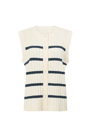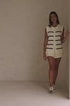 Wear it as a set or pair it with jeans, theΒ Depp Top is made from a high quality cotton blend rib knit in white with navy stripes. It is a boxy vest style featuring a round neckline, buttons down front and ribbed trims. Get the look with the Depp Shorts! Designed exclusively by Sabo.