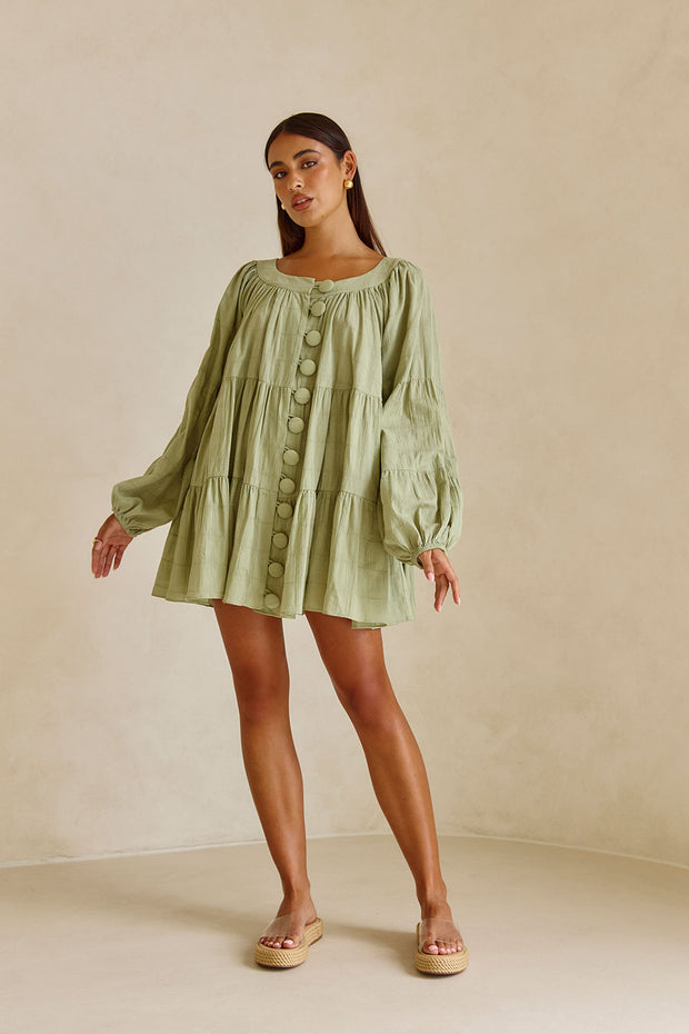 Stylish and super easy-to-wear, theΒ East Dress is made from a natural cotton self check fabric in a soft green hue. It features covered button and loops at centre front, puff sleeves, gathered panels throughout and a mini length. Add heels for the perfect look to take you from day to night! Designed exclusively by Sabo.Β
