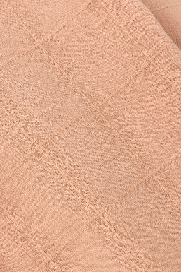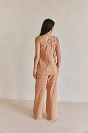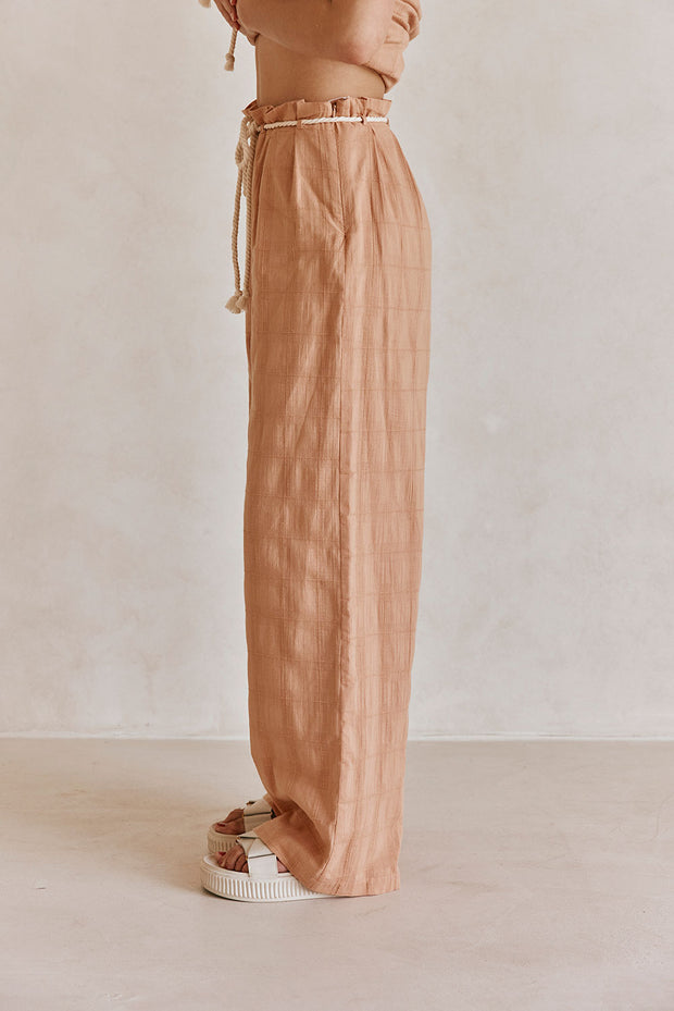 The vacation inspiredΒ Emmie Pants are made from a natural self check cotton fabric in a dusty rust hue. They are a high waisted style featuring a paper bag waist with loop and rope tie detail and long wide leg pants. Get the set with the Emmie Top and style with the tan Kia Sandals! Designed exclusively by Sabo.