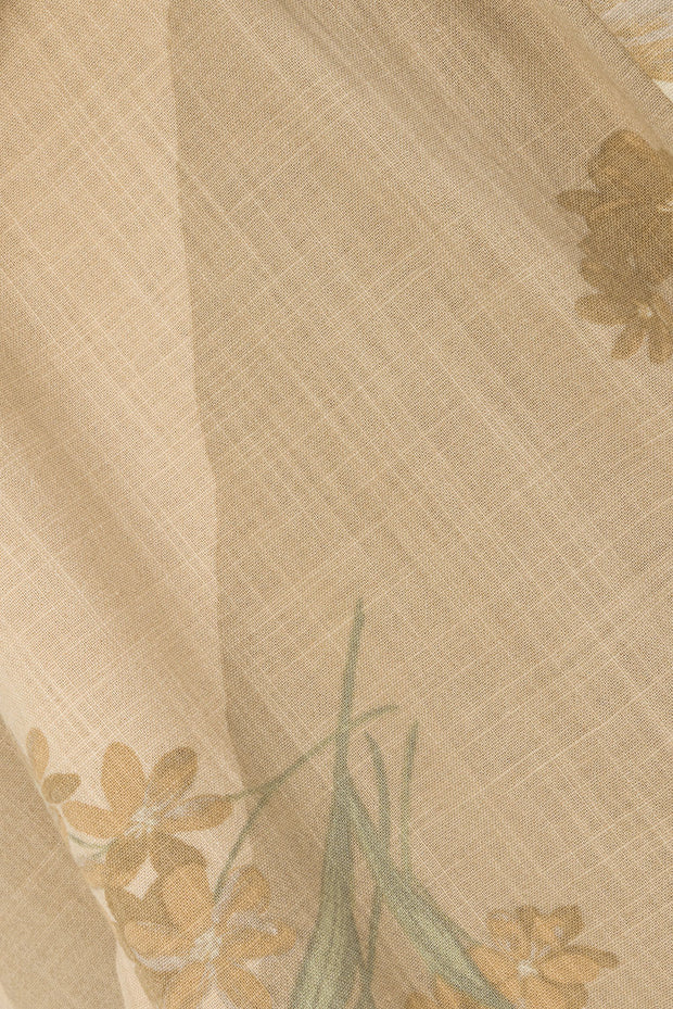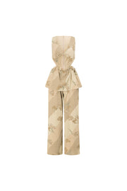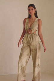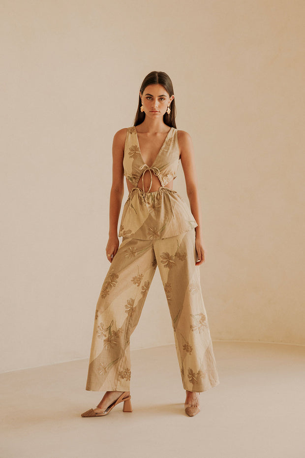 Step into your next event in style with the Esmae Jumpsuit, made from a high quality cotton slub fabric with our exclusive Tawny Bloom print. It features a V neckline, cutouts at waist with elastic trims and tie details, gathered flouncy panel at waist and long wide pants. Dress it up with the Zita Strappy Heels! Designed exclusively by Sabo.