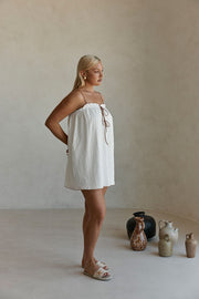 Dress it up with heels to take you from day-to-night! TheΒ Evelia Dress is made from a high quality natural raw cotton fabric in white. It is a relaxed mini style featuring thin tan straps, a straight neckline with frill trim with a contrast tan trim and V cutout at front with twin tan tie details. Style your look with the Catalina Heels! Designed exclusively by Sabo.