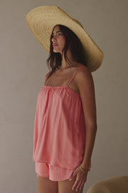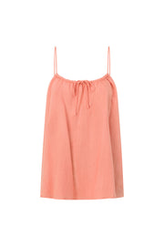 A super easy-to-wear shape from our La Donna collection! The Jetta Top is made from a high quality viscose slub fabric in a peach hue. It is a boxy cami style featuring rouleau straps, drawstring neckline with tie at centre neck and longline flouncy hem. Get the set with the Jetta Shorts. Designed exclusively by Sabo.