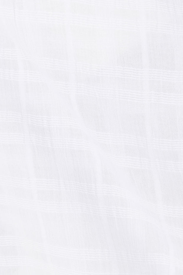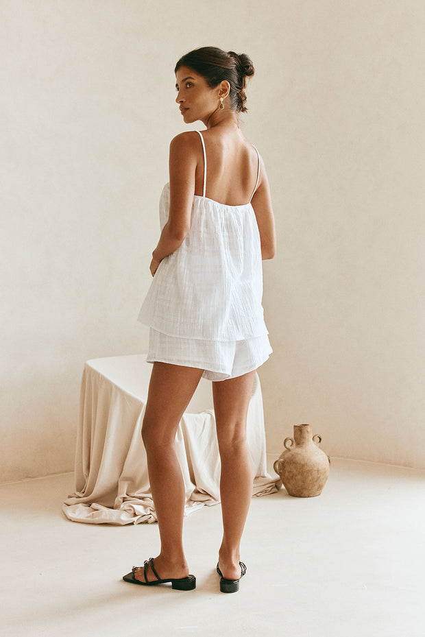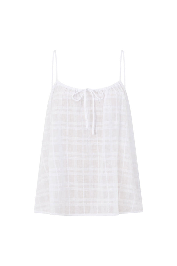 The crowd favourite Jetta set now in our natural cotton self plaid fabric in white! The Jetta Top features thin rouleau straps, adjustable draw neckline and a boxy fit. Get the look with the Jetta Shorts and Scarlett Sandals! Designed exclusively by Sabo.