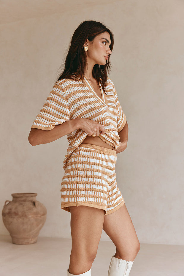 A cosy trans seasonal SABO signature set, theΒ Josie Shorts are made from a soft textured knit fabric with dusty orange and white stripes. They are a high waisted style featuring an elasticated waist, ribbed trims and high-low hems. Get the look with the Josie Top! Designed exclusively by Sabo.
