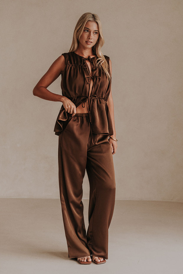 Super easy-to-wear in our luxurious matte silky fabric in a chocolate brown hue, theΒ Zen Pants are a high waisted style with a thin elasticated waist and drawstring and wide fit. Get the set with the Juliette Top! Designed exclusively by Sabo.