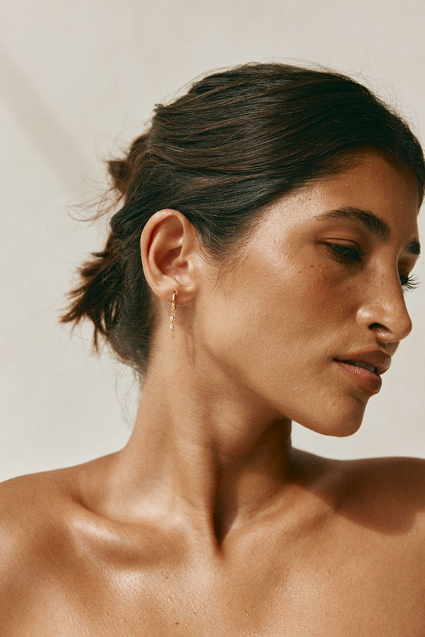 Simple and perfect for stacking, the Kartika Huggie Earrings are 18k gold plated and feature twin tassel chains with inlay gem details. Complete the look with the Twin Zephyr Ring!