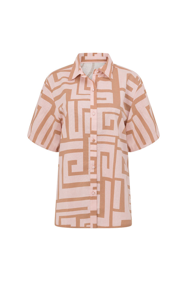 A signature SABO set, theΒ Kira Top is made from a structured natural linen cotton blend fabric with our exclusive Hellenic Maze print. It features short puff sleeves, collar, covered button opening at front and boxy fit with curved splits at sides. Get the look with the Kira Shorts! Designed exclusively by Sabo.