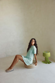 A chic set and cute styling piece, theΒ Leah Skirt is made from a natural cotton wave knit in a mint hue. It is a thin high elasticated waist with drawstring and mini a-line hem. Get the look with the Leah Top. Designed exclusively by Sabo.