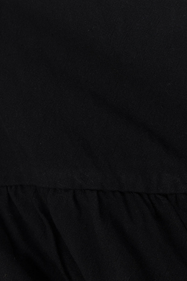 A super cute easy-to-wear SABO signature style, theΒ Luna Top is made from a natural cotton ramie blend fabric in black. It is a relaxed style featuring a collar, covered buttons at centre front, drop shoulders, boxy sleeves and a flouncy gathered panel across hem. Get the look with the Luna Shorts and black Vivian Sandals! Designed exclusively by Sabo.