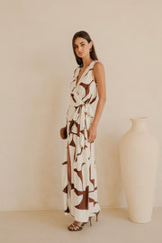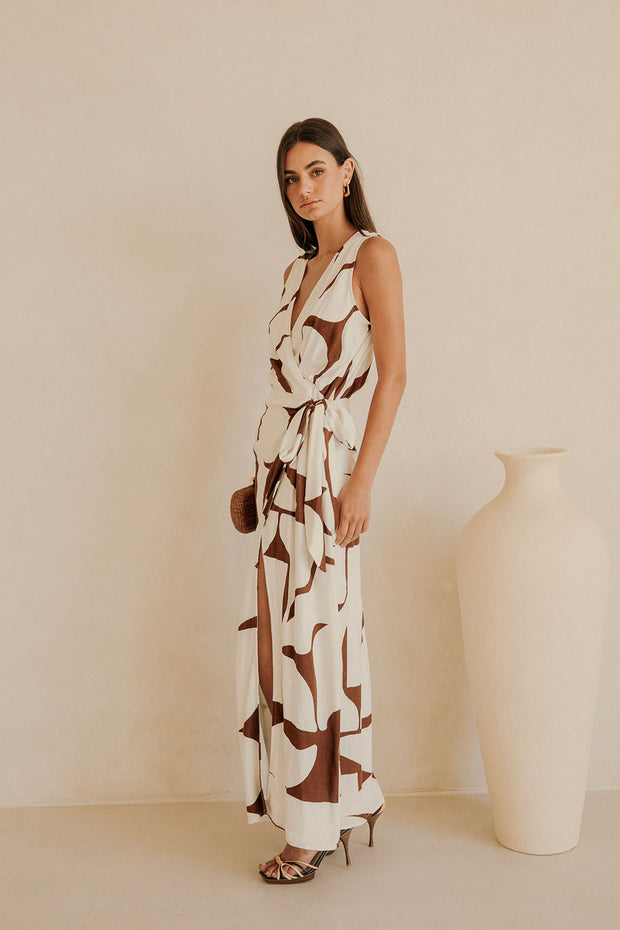 Perfect for an event or a long lunch with the girls! The Madeira Dress is made from a high quality viscose linen blend fabric with our exclusiveΒ Sunroom Chocolate print. It features a draped wrap neckline, tie detail at waist, flouncy maxi length skirt and a high split. Dress it up with the Bobbi Heels! Designed exclusively by Sabo.