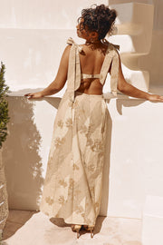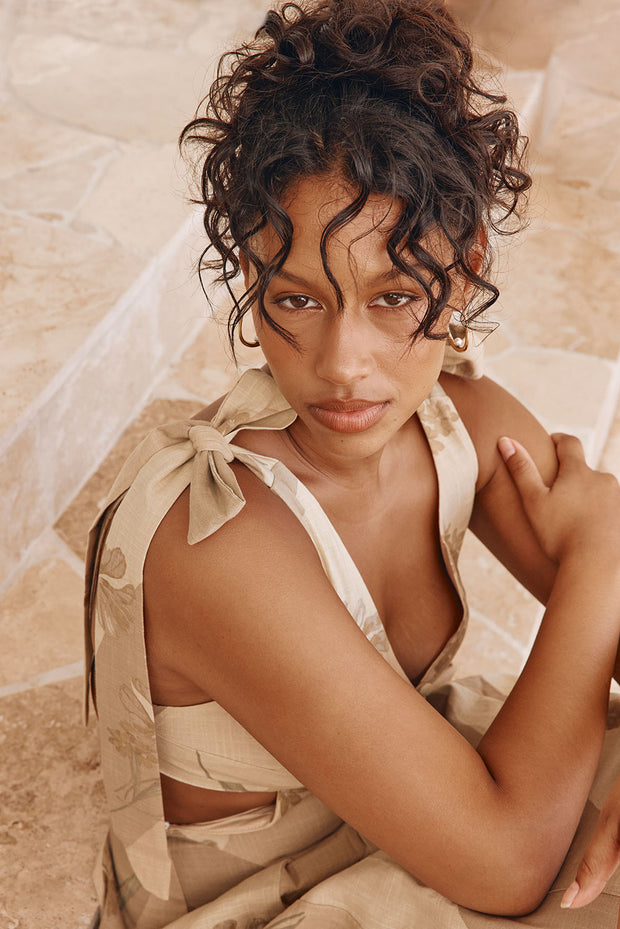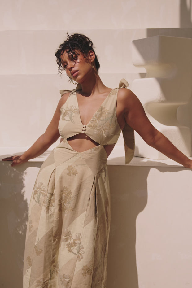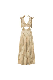 Designed to flatter, the Maivie Dress is made from a high quality cotton slub fabric with our exclusive Tawny Bloom print. It features a V neckline, thick tie shoulder straps, fitted bust and gold clasp closure at back, cutouts at waist and a flouncy maxi skirt. Dress it up with the Strappy Zita Heels for your next event! Designed exclusively by Sabo.