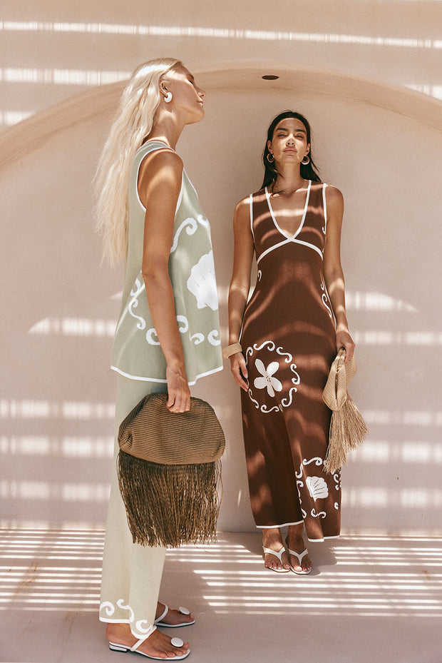 Our retro inspiredΒ Malani Pants are made from a natural cotton knit with our exclusive Ocean RelicΒ printΒ intarsia knitted throughout. They are a high waisted style featuring an elasticated waist, relaxed fit and contrast white bind trims. Get the set with the Malani Top! Designed exclusively by Sabo.
