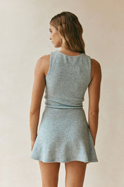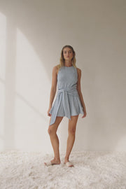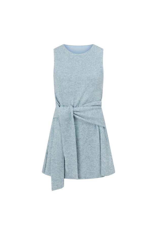 A cosy, easy-to-wear style, theΒ Narah Dress is made from a ribbed fabric in a marl blue hue. It features a high rounded neck, wide shoulders, thick wrap detail at waist and a flouncy skirt. Style your look with the Deka Sandals! Designed exclusively by Sabo.