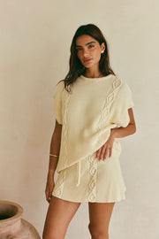 Get the set and pair it back with the Deka Sandals or boots as the weather cools down, theΒ Nevaeh Skirt is made from a high quality cotton blend fabric in a cream hue. It is a high waisted style featuring a thin elasticated waist with drawstring, cable details and a mini hem. Complete the look with theΒ Nevaeh Top! Designed exclusively by Sabo.