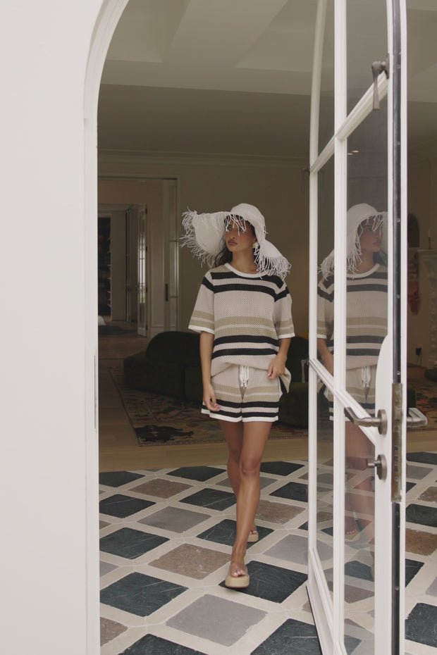 Elevate your casual wardrobe with the Quinn Stripe Top, made from a natural crochet knit fabric in beige, tan and black hues. It is a boxy style featuring drop shoulders with 1/2 length sleeves, rounded neckline, longline hem and contrast white trims. Complete the look with the Quinn Stripe Shorts and Riot Sunglasses! Designed exclusively by Sabo.
