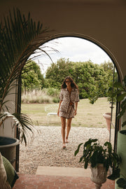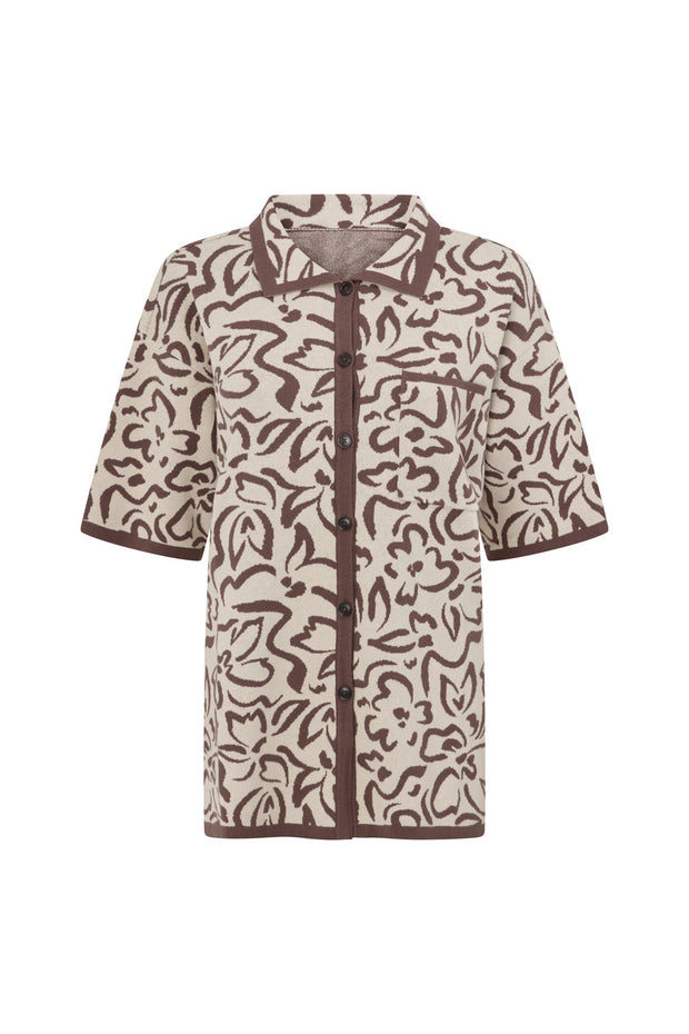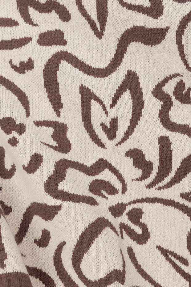 The perfect set for the cooler weather, theΒ Sarai Top is made from a natural cotton intarsia knit fabric in our warm neutral exclusive print. It is a boxy style featuring a collar and button opening, drop shoulders with short boxy sleeves, single breast pocket and contrast chocolate brown trims. Get the set with the Sarai Skirt. Designed exclusively by Sabo.