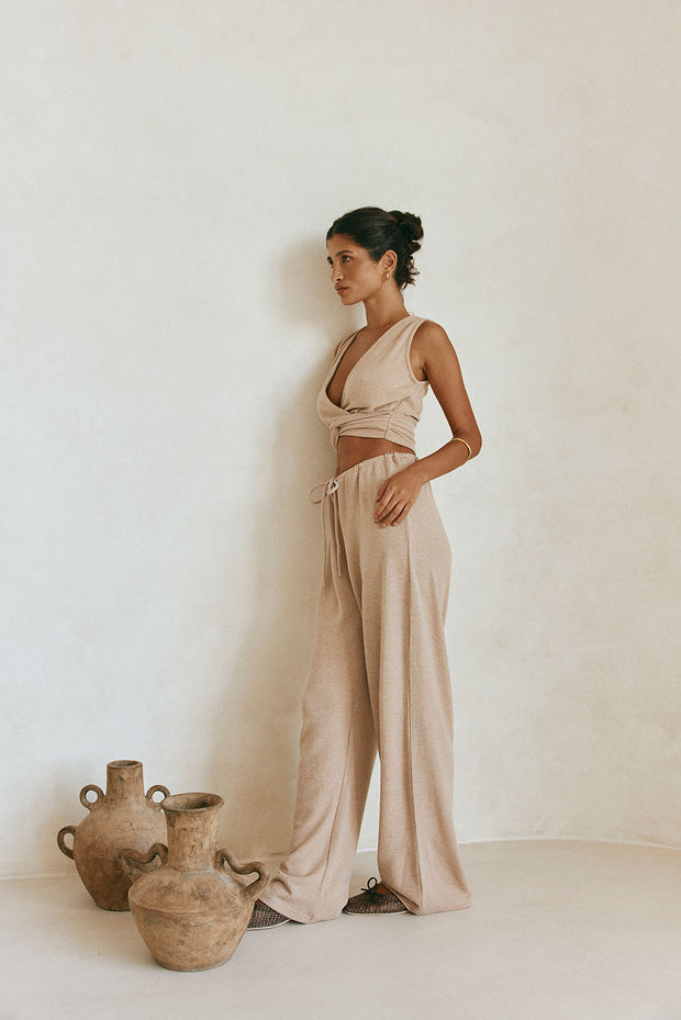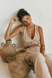 Wear it as a set or pair it back with denim! TheΒ Sierra Top is made from a soft woven fabric in a tan hue. It features a plunging cross-over V neckline, cropped hem and cutout and linked panel detail at waist. Get the set with the Sierra Pants! Designed exclusively by Sabo.