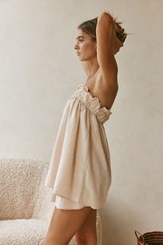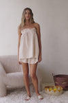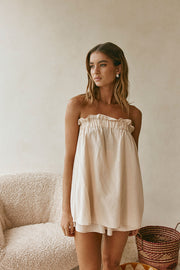 Designed to be a cute and easy-to-wear go-to set, theΒ Toni Top is made from a luxurious cotton blend fabric in a beige hue with a textured self stripe throughout. It is a strapless style featuring a thick elastic neckline with frill detail and an oversized flouncy top. Get the set with theΒ Toni Skirt and Tiera Platform Sandals! Designed exclusively by Sabo.