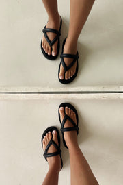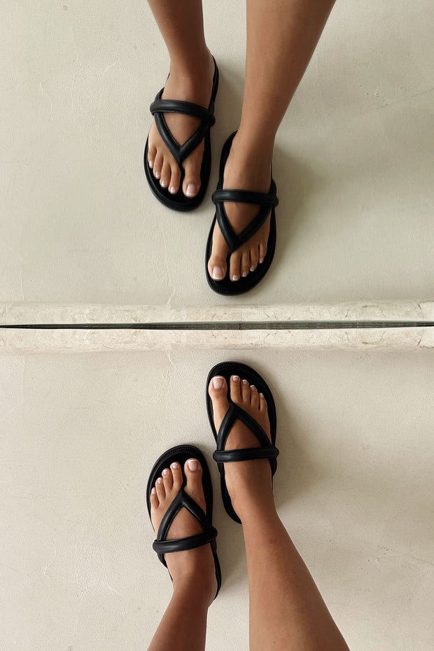 The perfect way to elevate your casual look! The Vivian Sandals are made from a high quality vegan leather in chic black. They feature a tan sole with contrast stitch, toe post and puffy strap details.Β Designed exclusively by Sabo.