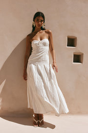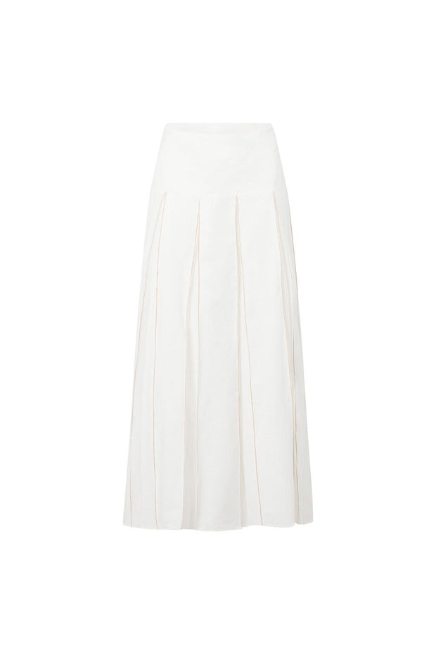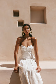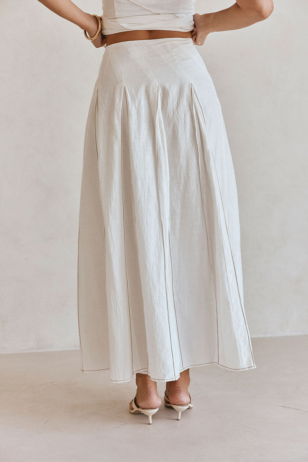 A classy set perfect for your next event! TheΒ Viviana Skirt is made from a high quality cotton slub fabric in white. It is a high waisted style featuring a fitted waist panel, a-line maxi skirt with pleats and contrast tan stitch details. Get the look with theΒ Viviana Top! Designed exclusively by Sabo.