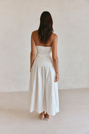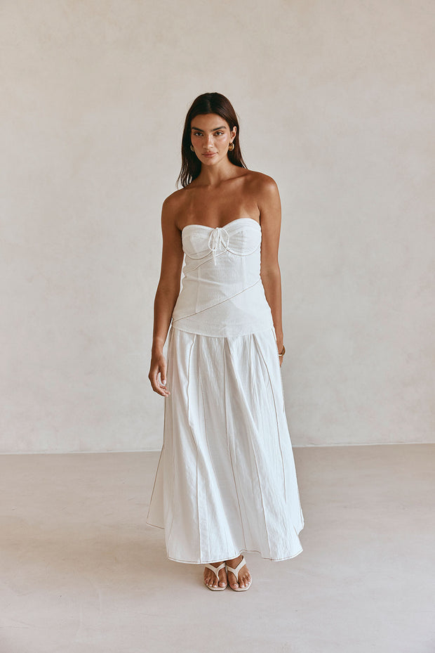 Wear it as a set or pair it back with jeans, theΒ Viviana Top is made from a natural cotton slub fabric in white. It features a strapless neckline, structured cups with underwire and tie detail, asymmetric panels at bodice, longline hem and contrast tan stitching details throughout. Get the look with theΒ Viviana Skirt! Designed exclusively by Sabo.