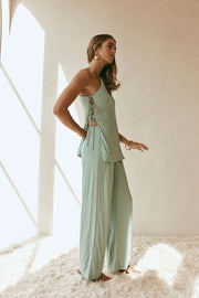Super easy-to-wear in our luxurious slinky fabric in a turquoise hue, theΒ Zen Pants are a high waisted style with a thin elasticated waist and drawstring and wide fit. Get the set with the Zen Top! Designed exclusively by Sabo.